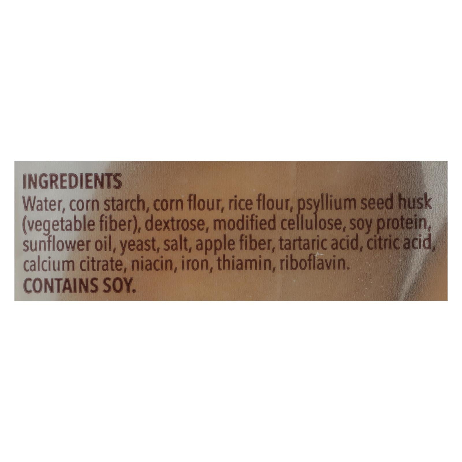 ingredients : corn starch;water;corn flour;rice flour;psyllium seed husk (vegetable fiber);dextrose;modified cellulose;soy protein;sunflower oil;yeast;salt;tartaric acid;citric acid