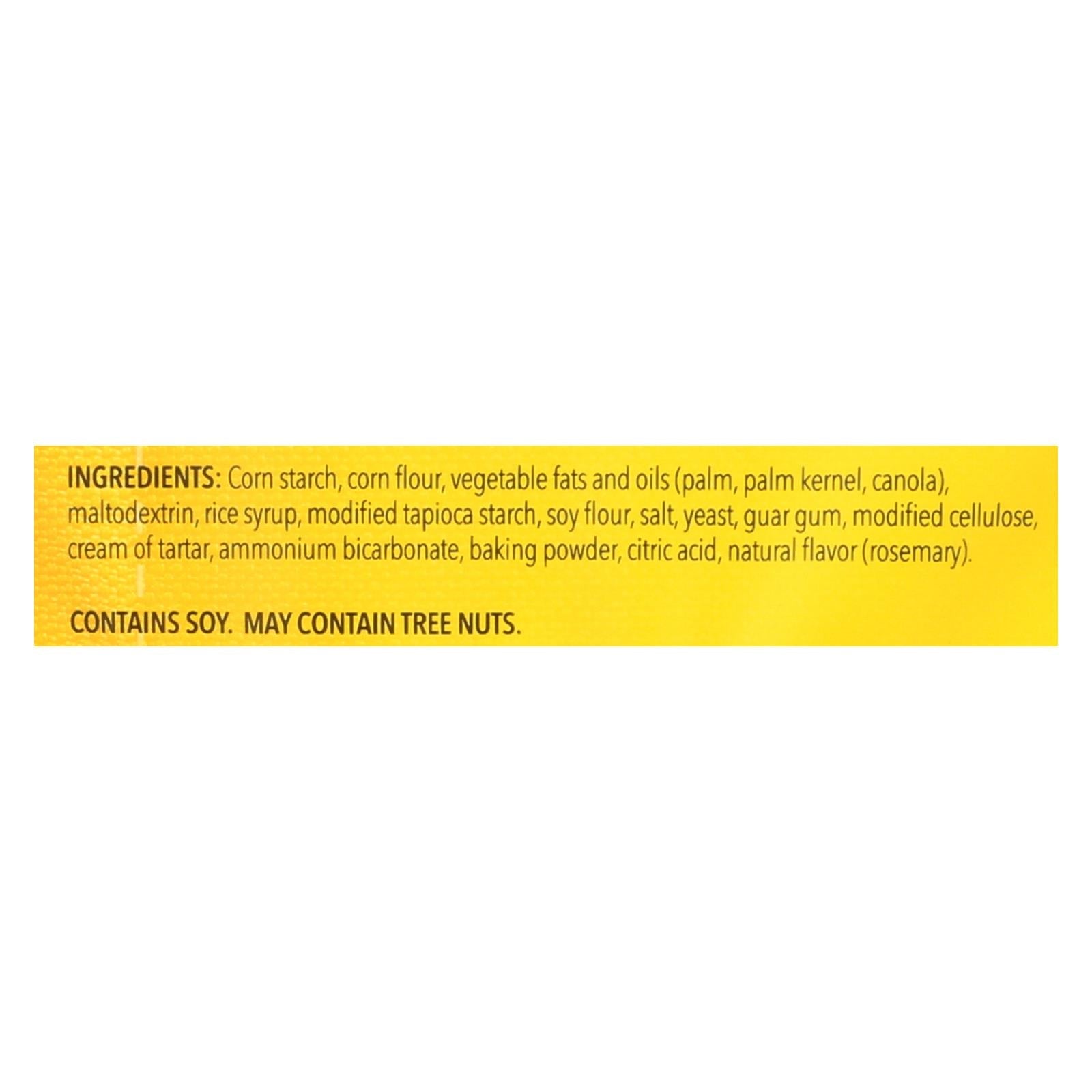 ingredients : non gmo corn starch;non gmo corn flour;blend of vegetable fats and oils (palm fat, sunflower oil);maltodextrin;rice syrup;modified tapioca starch;non gmo soy flour;sea salt;yeast;guar gum;modified cellulose;cream of tartar;ammonium bicarbonate;baking soda;citric acid;natural rosemary flavor