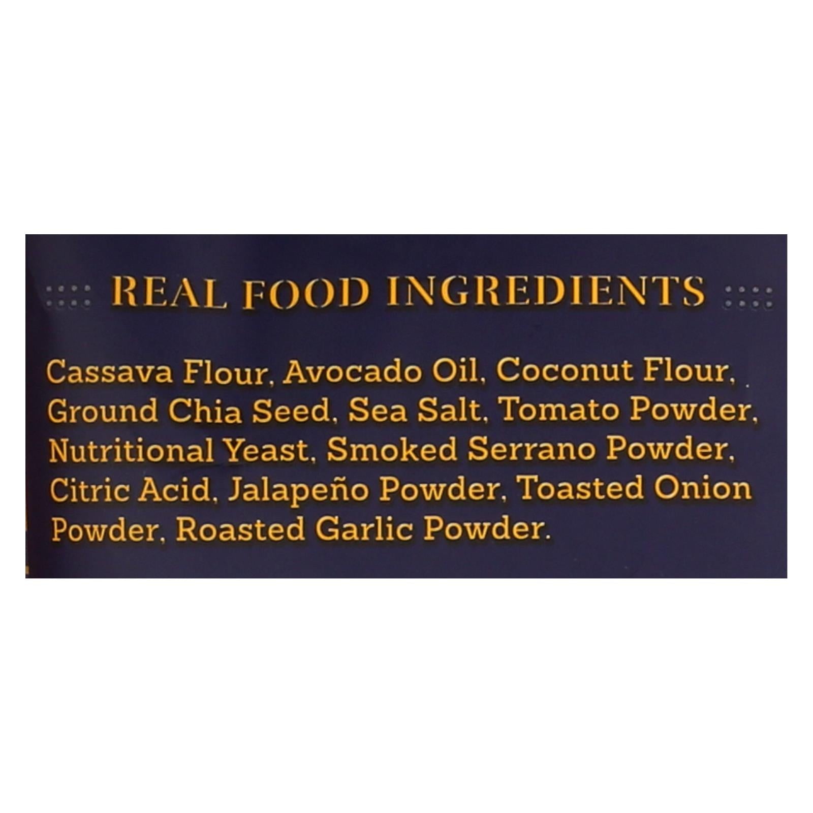 ingredients : cassava flour;avocado oil;coconut flour;chia seed;nutritional yeast;tomato powder;sea salt;citric acid;garlic powder;jalapeno powder;onion powder;serrano powder