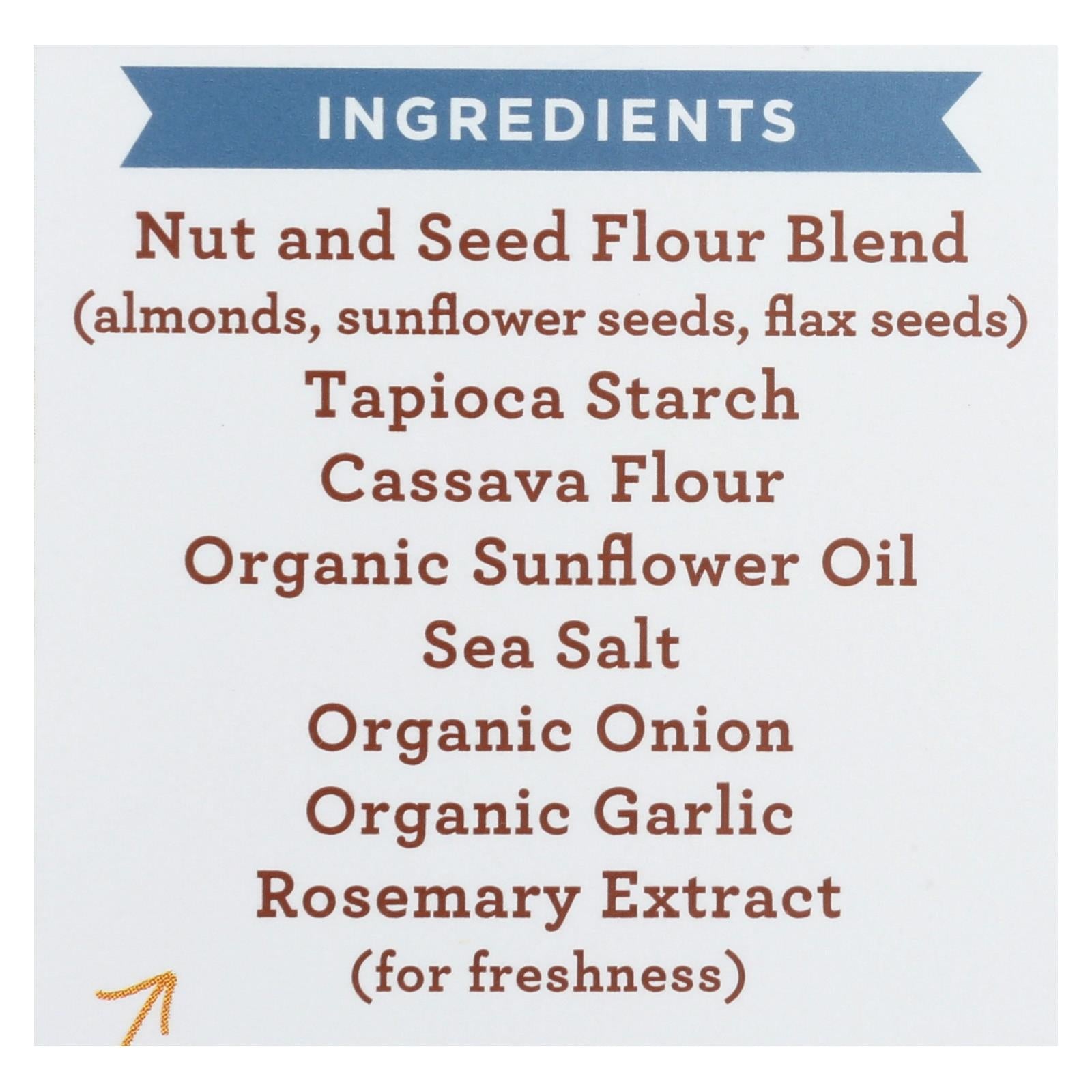 ingredients : nut and seed flour blend;almonds;sunflower seeds;flax seeds;tapioca starch cassava flour organic sunflower oil sea salt organic onion organic garlic rosemary extract;for freshness