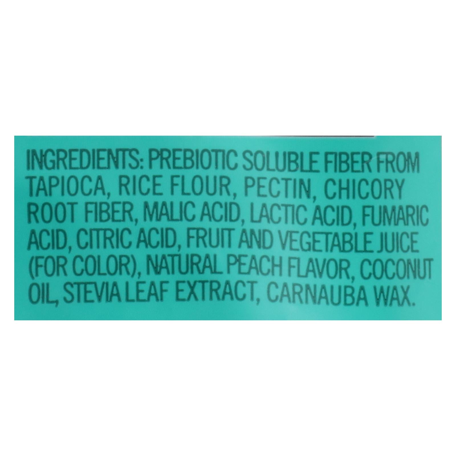 ingredients : non-gmo soluble corn fiber;allulose;isomalto-oligosaccharides (vegetable source);chicory root fiber;rice flour;modified potato starch;malic acid;lactic acid;fumaric acid;natural peach flavor;fruit and vegetable juice (for color);citric acid;coconut oil;carnauba wax;stevia leaf extract;monk fruit extract