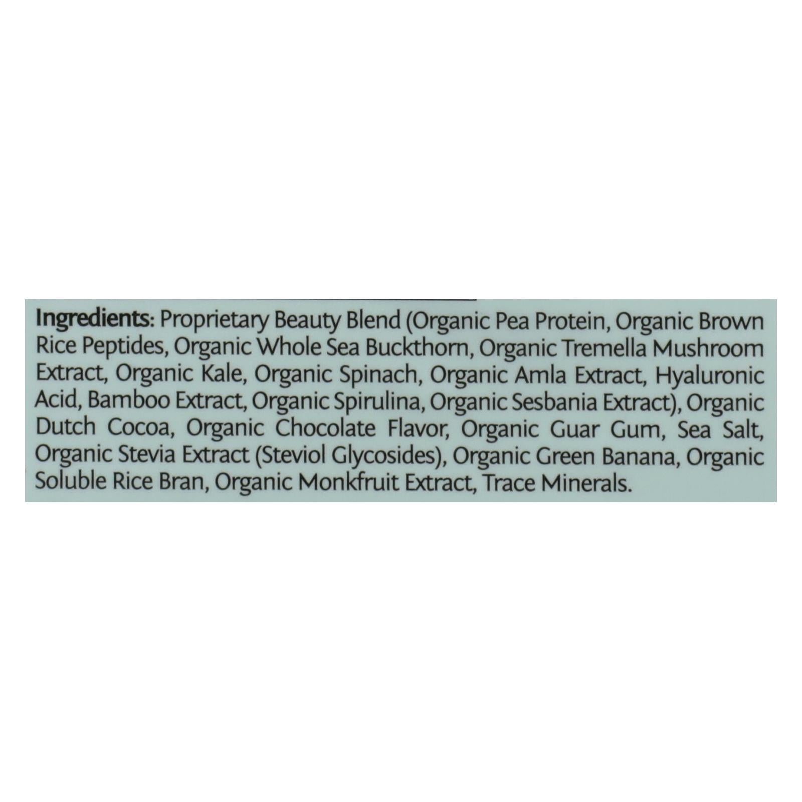 ingredients : proprietary beauty blend;organic pea protein;organic brown rice peptides;organic whole sea buckthorn;organic tremella mushroom extract;organic kale;organic spinach;organic amla extract;hyaluronic acid;bamboo extract;organic spirulina;organic sesbania extract;organic dutch cocoa;organic chocolate flavor;organic guar gum;sea salt;organic stevia extract;steviol glycosides;organic green banana;organic soluble rice bran;organic monkfruit extract;trace minerals