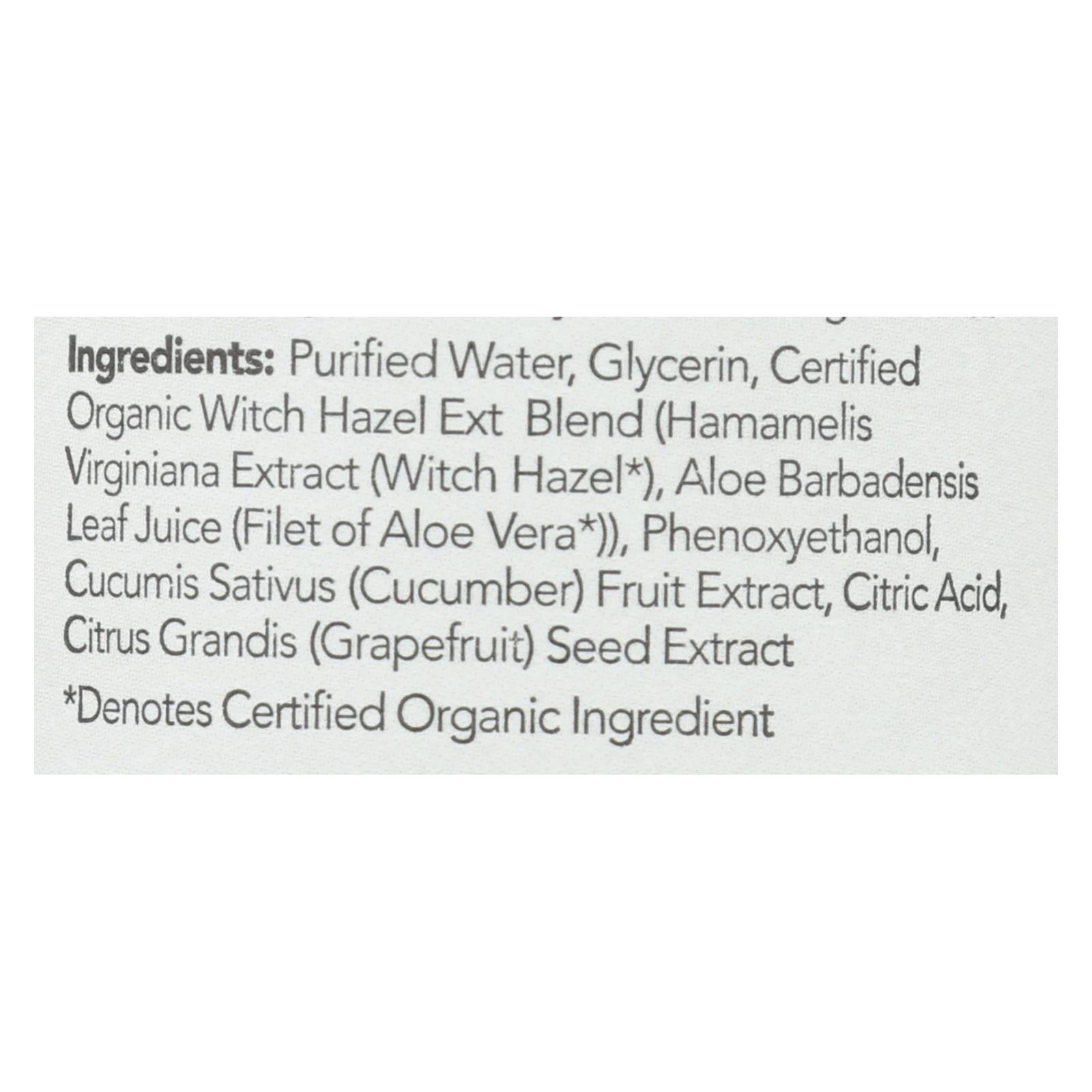 ingredients : purified water;glycerin;certified organic witch hazel ext blend;hamamelis virginiana extract;witch hazel;aloe barbadensis leaf juice;filet of aloe vera;phenoxyethanol;cucumis sativus;cucumber;fruit extract;citric acid;citrus grandis;grapefruit;seed extract