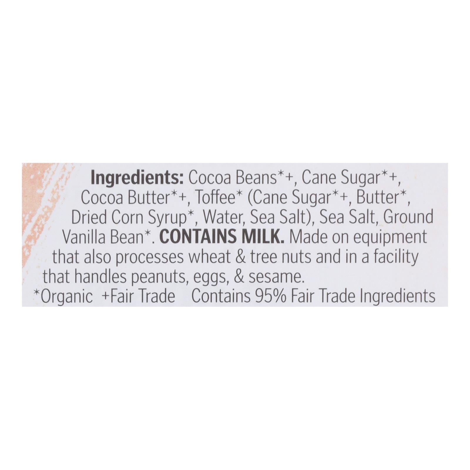ingredients : cocoa beans*+;cane sugar*+;cocoa butter*+;toffee* (cane sugar*+, butter*, dried corn syrup*, water, sea salt);sea salt;ground vanilla bean