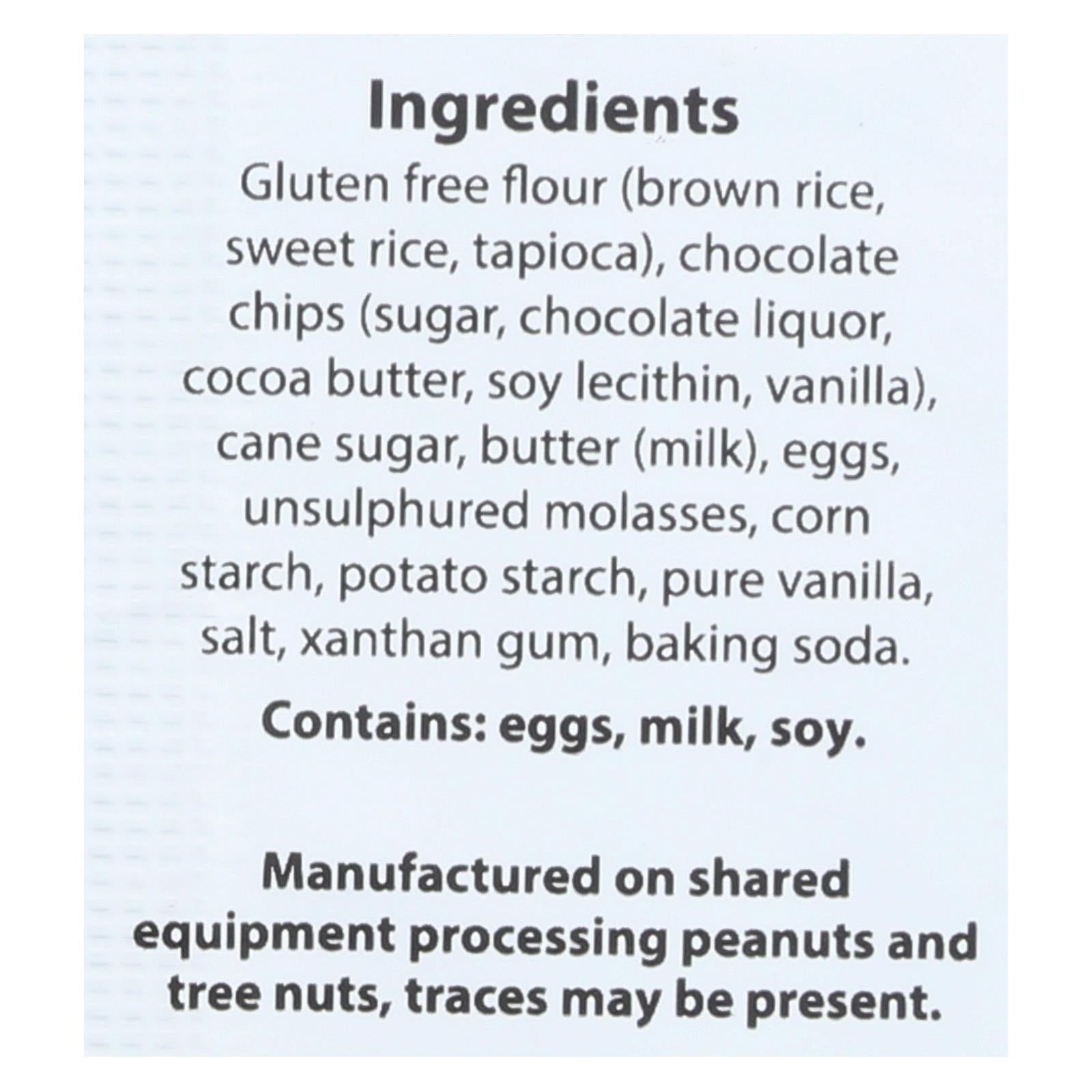ingredients : gluten free flour;brown rice;sweet rice;tapioca;chocolate chips;sugar;chocolate liquor;cocoa butter;soy lecithin;vanilla;cane sugar;butter;milk;eggs;unsulphured molasses;corn starch;potato starch;pure vanilla;salt;xanthan gum;baking soda