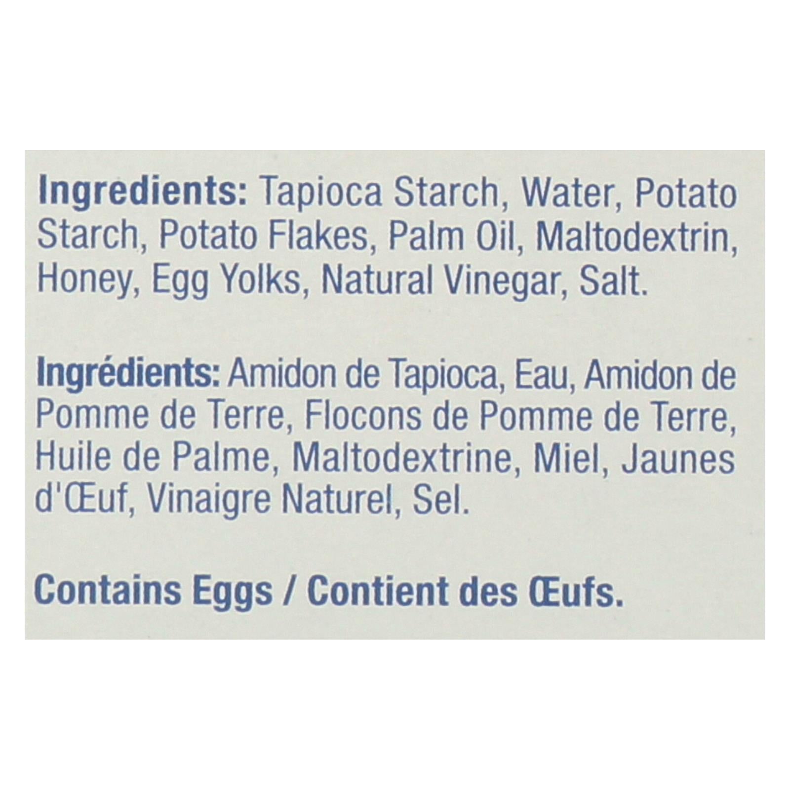 ingredients : tapioca starch;water;potato starch;potato flakes;palm oil;maltodextrin;honey;egg yolks;natural vinegar;salt